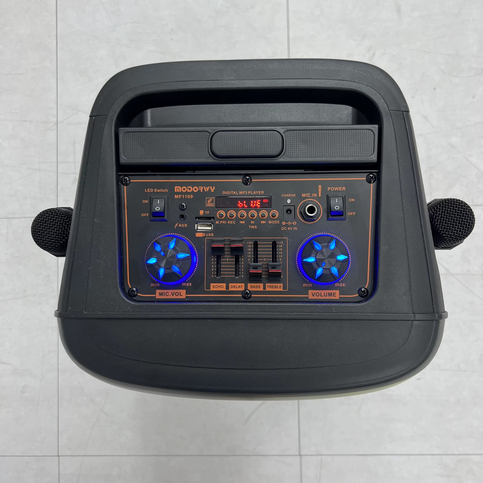 Son de haute qualité : Profitez d’un son clair et puissant avec des réglages BASS, TREBLE, et ECHO pour personnaliser votre expérience musicale ou karaoké selon vos préférences.