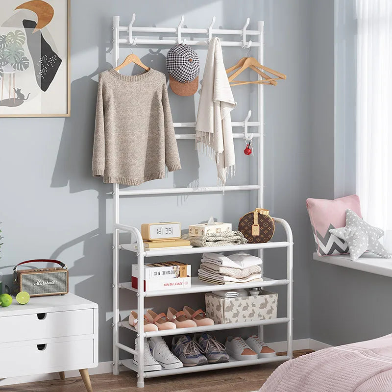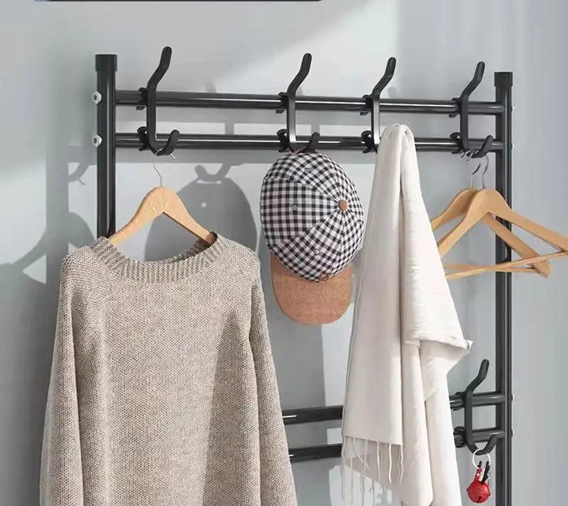 Ce porte-chaussures à plusieurs niveaux est idéal pour garder vos chaussures organisées et à l'abri de la poussière. Le cintre pour vêtements ménagers intégré vous permet de stocker encore plus d'articles, tandis que le dortoir intérieur offre un espace de rangement supplémentaire. Avec sa construction résistante et son support au sol stable, c'est un ajout pratique à toute garde-robe.